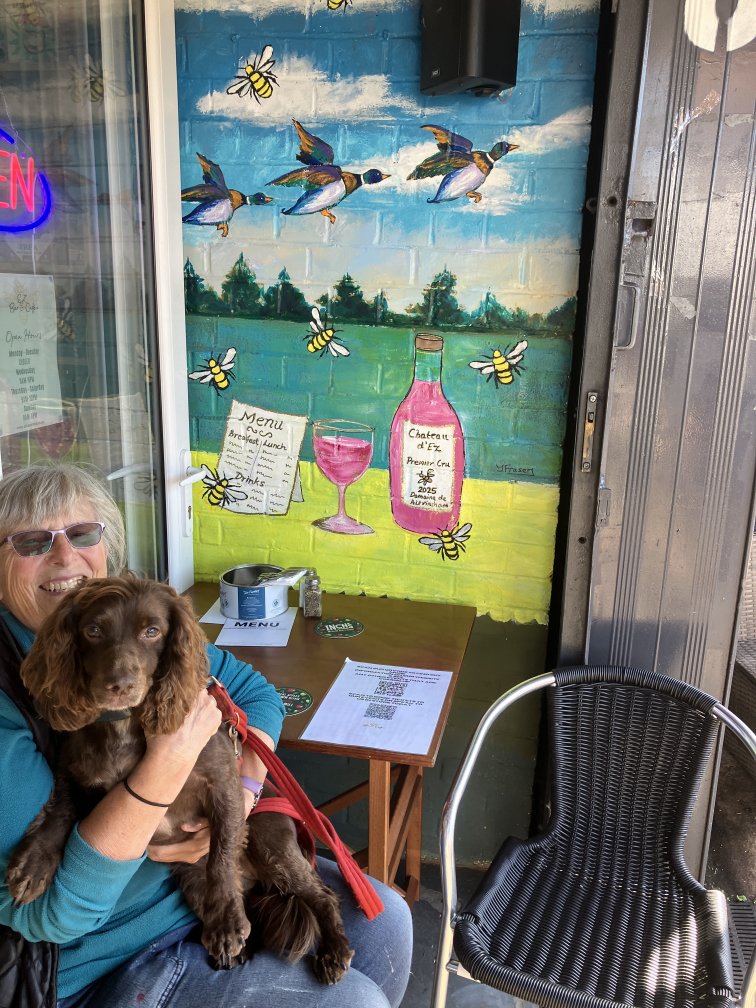 Jane Fraser and friend beside one of her freshly-painted murals (acrylic on prepared brickwork) in the EZ bar and cafe underneath the Arches in Broadheath